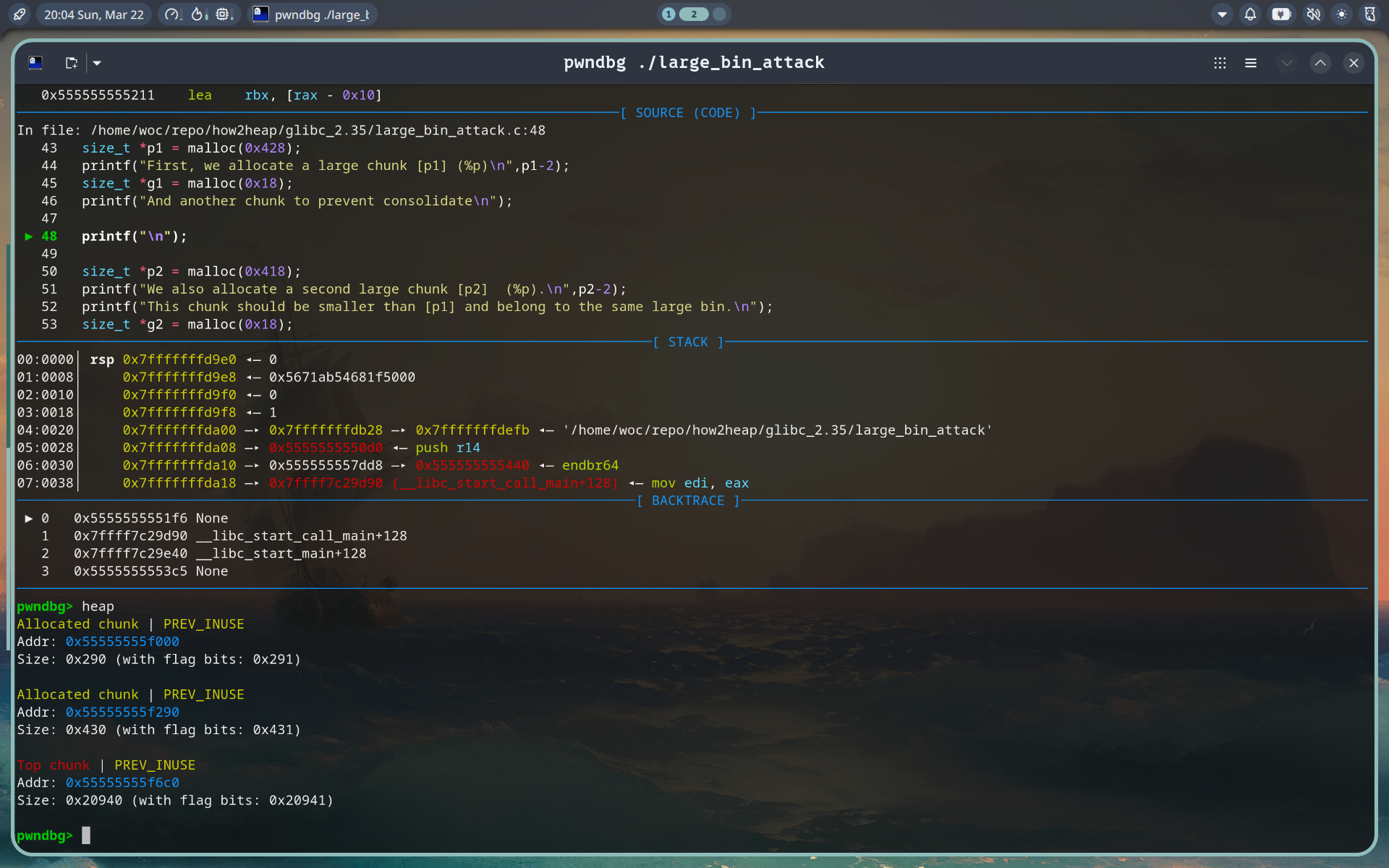 执行large bin attack的时候,发现最后的assert失败。调试后发现,问题出在:程序似乎直接跳过了代码中的malloc(0x18)部分,导致两个相邻的large bin合并,后面完全失控。
